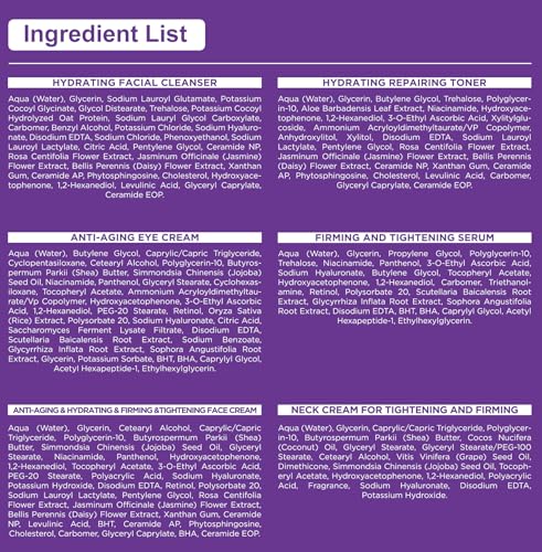 Smooth,Tighten,Lift,Firm and Anti-Aging: The firming,tightening & hydrating face cream,firming,anti-aging & hydrating serum,repairing,puffiness & dark circles eye cream,anti-aging,firming & tightening neck cream working together to help hydrates,nourishes,and moisturizes skin,firms,tightens,balance oil and water levels,while improving elasticity,dehydration & dryness,fine lines & wrinkles and uneven skin tone,restores firmness and reveals smoother,younger-looking skin